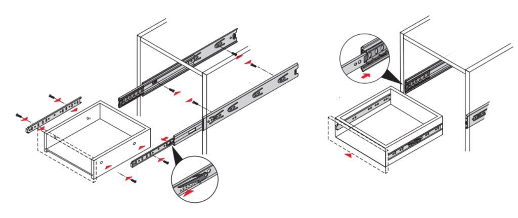 Kugleudtrækket monteres i skabet og i skuffen med fladhovede montageskruer eller træskruer. Der anvendes ikke kugleløbsskruer til montering af 56 mm udtræk.