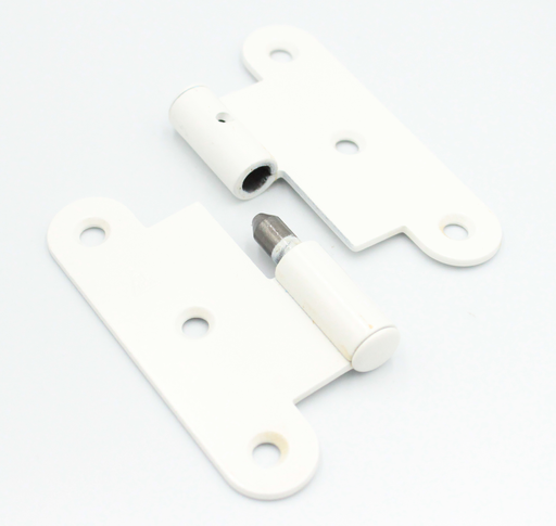 Dette er et fint forholdsvis kraftigt dørhængsel i hvidmalet metal. Hængslet er primært til inderdøre.