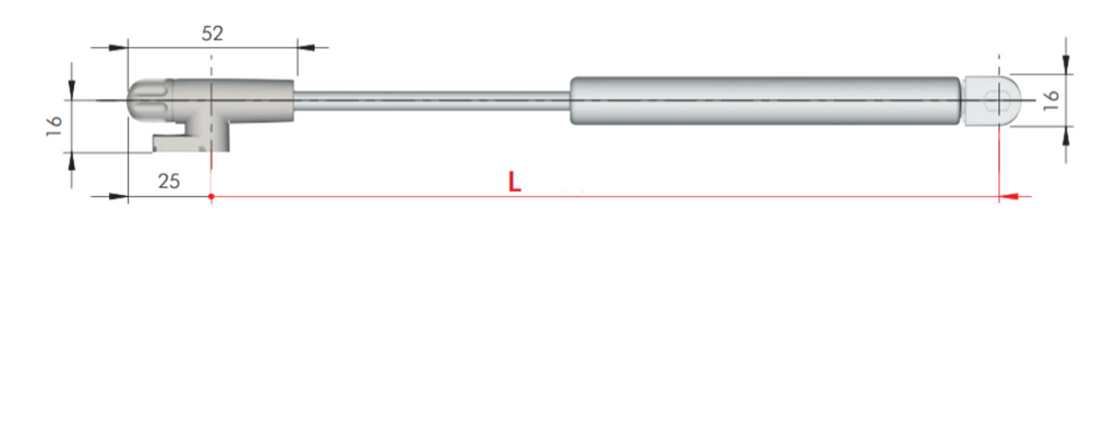 For at finde frem til den rigtige model, skal du måle afstanden imellem de 2 punkter, hvor dæmperen isættes. Det er det mål, som vi beskriver som L på tegningen. Afstanden imellem de 2 montagepunkter er 355 mm c/c for denne vare, når gasdæmperen er helt udstrakt. Har du et andet mål, så er det ikke dette produkt, som du skal bestille.