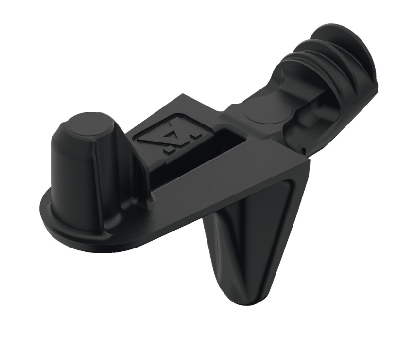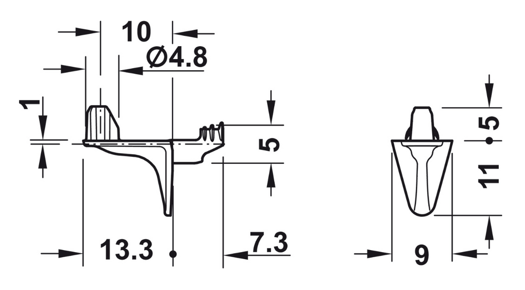 Dette er en hyldebærer med tap, som passer i et Ø5 mm hul. Hyldebæreren placeres som en vinkel og giver dermed god understøtning til hylden.