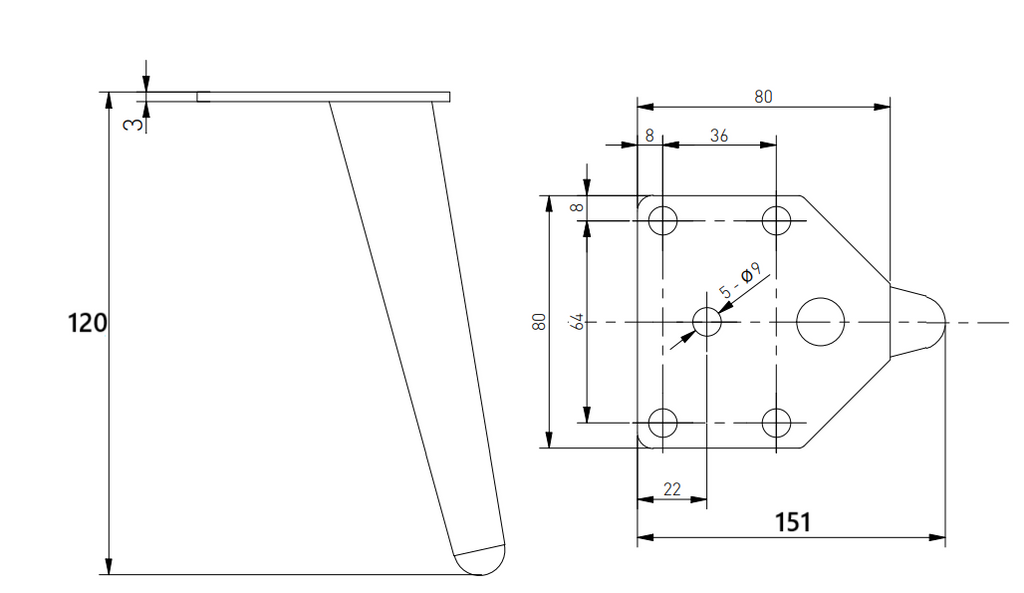 Pladen måler 80x80 mm og har en tykkelse på 3 mm. Der er flere mål på tegningen.